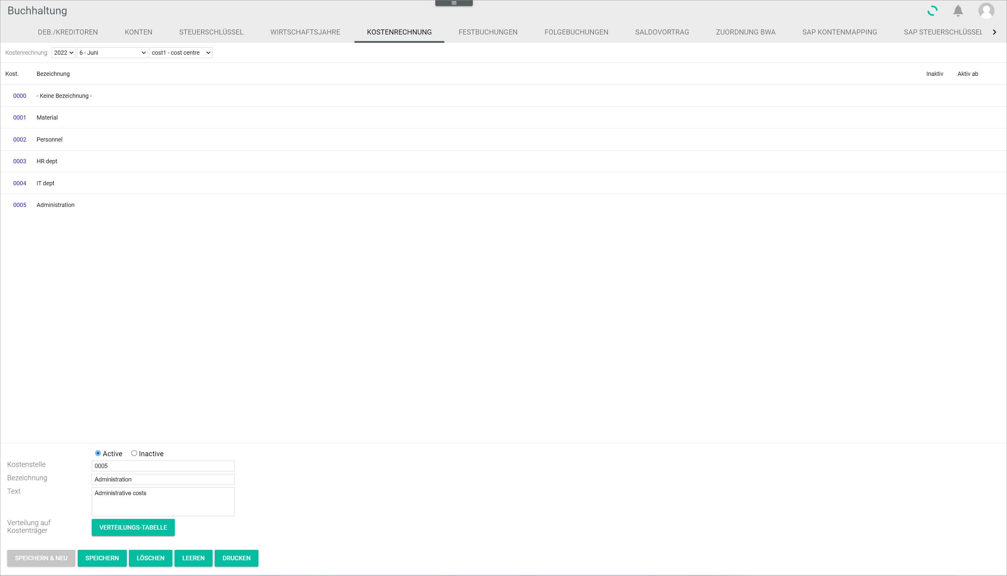 All existing cost centers for the selected period are displayed in the list below. The input fields at the bottom are displayed for a cost center.